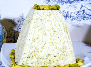 5. Через 8 годин перевернути форму на тарілку, зняти форму, марлю і прикрасити паску почищеними фісташками (100 г).