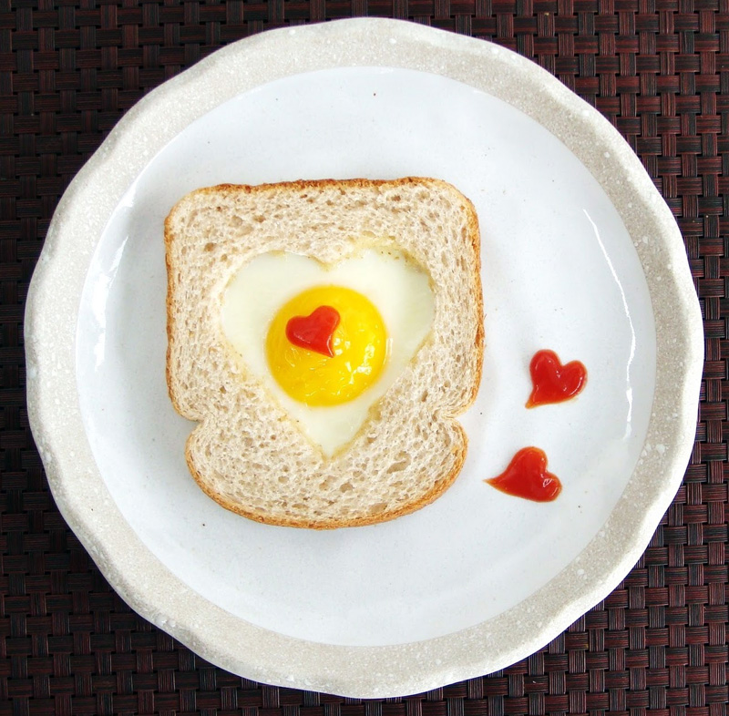 Потіште свою другу половинку звичайно-незвичайним сніданком. За допомогою формочки виріжте у шматку хліба сердечко. Вибийте всередину яйце і підсмажте на сковороді. Прикрасьте тост за допомогою кетчупу.