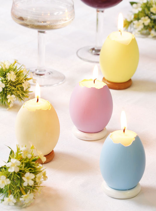 Ви можете самі виготовити свічки в оригінальних свічниках. В якості свічників можна використовувати яєчну шкаралупу. Для цього акуратно розбийте яйце посередині і витягніть його вміст. Таким чином, з одного яйця у вас вийде два великодніх свічника. Їх можна пофарбувати в яскраві кольори, потім поставити в них свічки і прикрасити ними великодній стіл. Таким же способом можна зробити свічник зі шкірки лимона або апельсина.